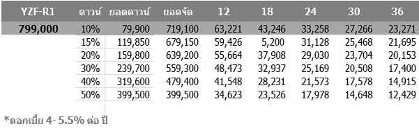 ราคา Yamaha-R1 799,000.บาท จำหน่ายอย่างเป็นทางการรวมภาษีมูลค่าเพิ่ม, รวมทะเบียน + พรบ. แล้วราคาอาจเปลี่ยนแปลงได้ขึ้นอยู่กับแต่ละ Dealer และพื้นที่ สามารถดาวน์ที่ 10% ของราคารถ ผ่อนนาน