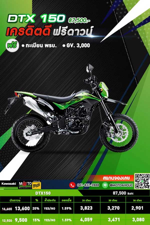 KAWASAKI DTX150 มอไซค์สไตล์ Super Motard : D-Tracker 150 มาพร้อมรูปลักษณ์โฉบเฉี่ยวด้วยล้อขนาด 17 นิ้ว และการตกแต่งที่หวือหวามากขึ้น แต่ยังแฝงไว้ด้วยความดุดัน สะท้อนถึงสมรรถนะที่ถูกพัฒนาขึ้นไปอีกขั้น