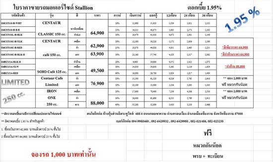 ตารางผ่อน 2017-2018 รถมอเตอร์ไซค์stallion centaur 250 max สนใจออกรถมอเตอร์ไซค์stallion