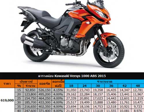 Kawasaki Versys 1000 ABS เครื่องยนต์กำลังสูง 1,043 ซีซี DOHC 16 วาล์ว 4 จังหวะ 4 สูบ ระบายความร้อนด้วยน้ำ 6 เกียร์  ราคา619,000 บาท มีให้เลือกสีส้มดำ สีเขียวดำ ดาวน์ 15% ต้องมีคนค้ำ ใช้เงินออกรถ 92,850 บาท ผ่อนสูงสุด 48 งวด ดอกเบี้ย 4.15% โดยผ่อน 18 งวด งวดละ 31,050 บาทต่อเดือนผ่อน 24 งวด งวดละ 23,743 บาทต่อเดือนผ่อน 30 งวด งวดละ 19,358 บาทต่อเดือนผ่อน 36 งวด งวดละ 16,435 บาทต่อเดือนผ่อน 42 งวด งวดละ 14,347 บาทต่อเดือนผ่อน 48 งวด งวดละ 12,781 บาทต่อเดือน