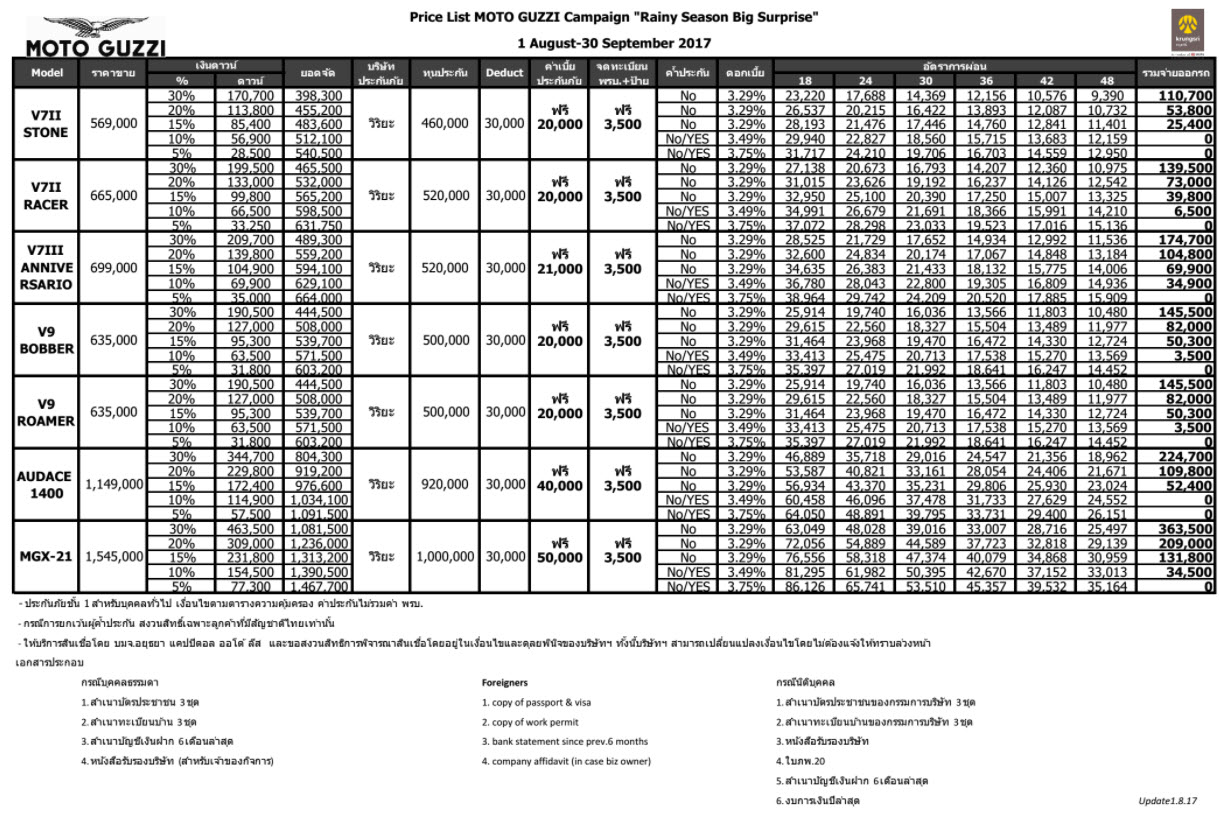 ราคา อัตราผ่อนดาวน์รถมอเตอร์ไซค์MOTO GUZZI   กับ สินเชื่อกรุงศรี ไฟแนนซ์