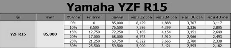 สำหรับการอ ผ่อน การดาวน์yamaha r15 150 cc.บางร้านจำหน่ายอาจมีการดาวน์ ศูนย์ เปอร์เซ็น ผ่อนนานถึง 48 เดือนตกเดือนหล่ะ 3,xxxบาท จริงๆควรใช้เงินดาวน์สูงๆหน่อยจะได้ผ่อนเบาๆจะได้เหลือเงินไว้เติมน้ำมัน และแต่งรถเพิ่มเติม จะได้ไม่ลำบากมาก และเอกสารสำหรับใช้ซื้อรถผ่อนก็จะมีสำเนาบัตรประชาชน 3 ชุดสำเนาทะเบียนบ้าน 3 ชุด สมุดบัญชีย้อนหลัง 6 เดือน / สเตรทเม้นท์ 6 เดือน หรือ หนังสือรับรองเงินเดือนล่าสุด / สลิปเงินเดือนล่าสุด